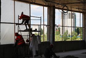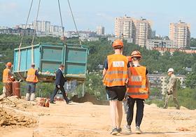 Визит министра просвещения России Сергея Кравцова в Нижний Новгород. Жанровая фотография. Работы по строительству корпуса "Школы 800" в микрорайоне Верхние Печеры.