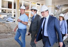 Визит министра просвещения России Сергея Кравцова в Нижний Новгород. Министр просвещения России Сергей Кравцов (справа) и губернатор Нижегородской области Глеб Никитин (в центре) во время посещения строительства корпуса "Школы 800" в микрорайоне Верхние Печеры.