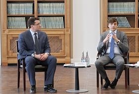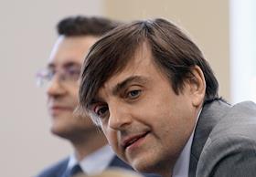Визит министра просвещения России Сергея Кравцова в Нижний Новгород. Министр просвещения России Сергей Кравцов (справа) и губернатор Нижегородской области Глеб Никитин (слева) во время мероприятия "Новое знание в новом мире образования. Дискуссионная площадка Российского общества "Знание" в Нижегородском государственном педагогическом университете им. К. Минина (Мининский университет).