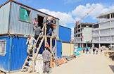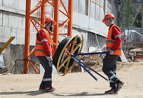 Визит министра просвещения России Сергея Кравцова в Нижний Новгород. Жанровая фотография. Работы по строительству корпуса "Школы 800" в микрорайоне Верхние Печеры. Рабочие возле жилых вагончиков на территории стройки.
