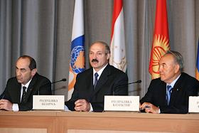 Президент Белоруссии Александр Лукашенко (слева), президент Таджикистана Эмомали Рахмонов (второй слева), президент Казахстана Нурсултан Назарбаев (третий слева), президент Армении Роберт Кочарян (четвертый слева), Президент России Владимир Путин (третий справа), президент Узбекистана Ислам Каримов (второй справа) и президент Кыргызской республики Курманбек Бакиев (справа) на Саммите Организации Договора о коллективной безопасности (ОДКБ).