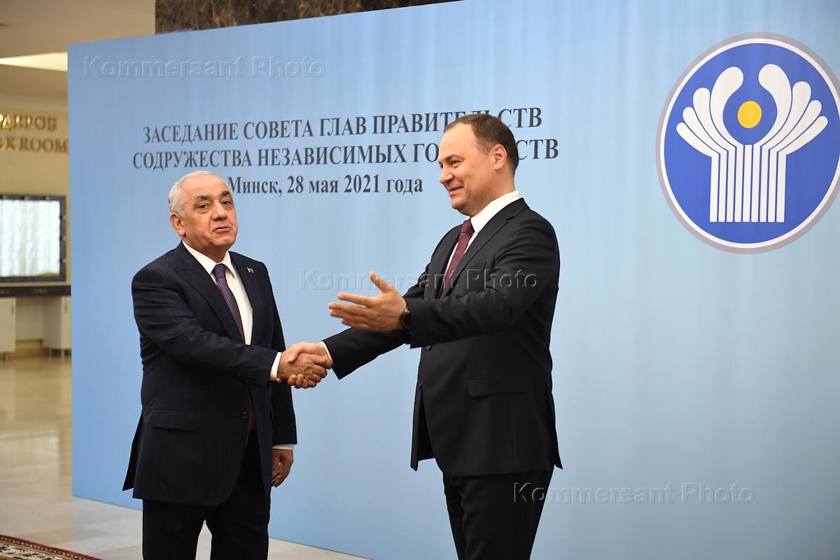 Рабочая поездка председателя правительства России Михаила Мишустина в Минск. Премьер-министр Азербайджана Али Асадов (справа) и премьер-министр Республики Беларусь Роман Головченко (слева) на церемонии совместного фотографирования перед началом заседания Совета глав правительств СНГ в Минске.