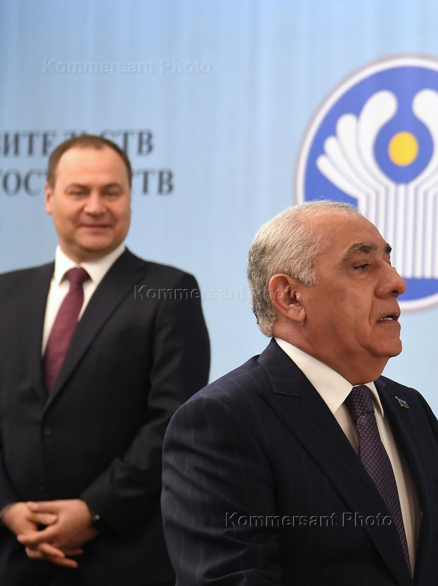Рабочая поездка председателя правительства России Михаила Мишустина в Минск. Премьер-министр Азербайджана Али Асадов (слева) и премьер-министр Республики Беларусь Роман Головченко (справа) на церемонии совместного фотографирования перед началом заседания Совета глав правительств СНГ в Минске.