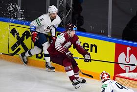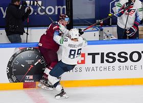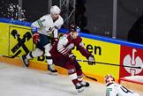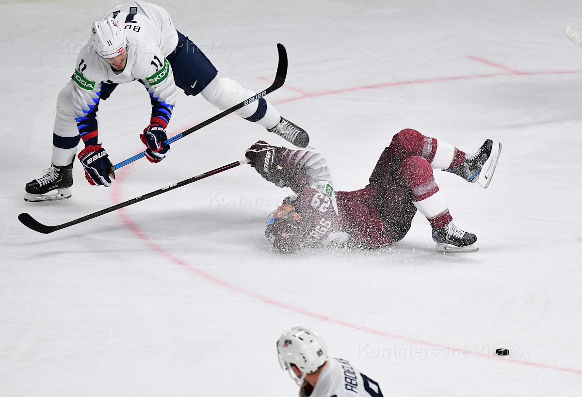 Чемпионат мира по хоккею. Матч между сборными США и Латвии на стадионе "Арена-Рига".Игрок сборной Латвии Рональд Кениньш (слева) и игрок сборной США Джастин Абделкейдер (справа) во время матча.