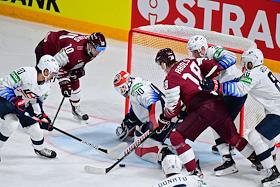 Чемпионат мира по хоккею. Матч между сборными США и Латвии на стадионе "Арена-Рига". Вратарь сборной Латвии Матис Кивлениекс (второй слева) и игрок сборной США Крис Уайдман (слева) во время матча.