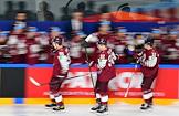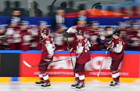Чемпионат мира по хоккею. Матч между сборными США и Латвии на стадионе "Арена-Рига". Справа налево: игроки сборной Латвии Рихард Маренис, Артур Кулда и Оскар Батня во время матча.