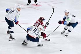 Чемпионат мира по хоккею. Матч между сборными США и Латвии на стадионе "Арена-Рига". Слева направо: игроки сборной США Мэтт Теннисон, Колин Блэквелл, игрок сборной Латвии Рихард Букартс и игрок сборной США Зак Джонс во время матча.