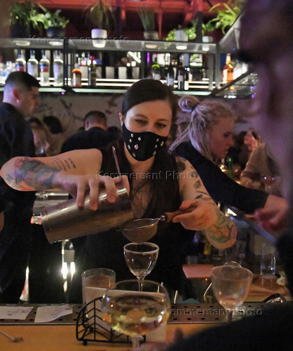 Жанровая фотография. Бариста в медицинской маске во время обслуживания посетителей кафе.