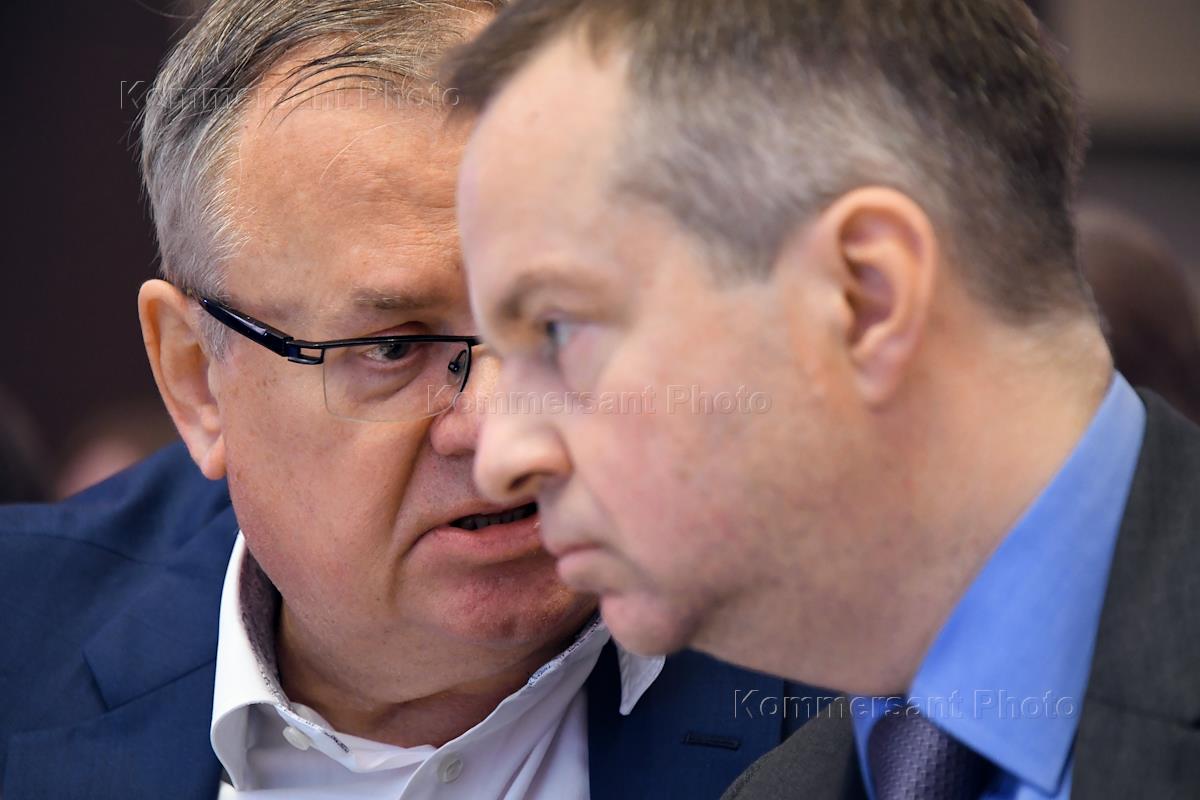 III Съезд Ассоциации банков России "Банки и их роль в реализации Общенационального плана восстановления экономики" в отеле "Хаятт Ридженси Москва Петровский Парк". Президент, председатель правления ПАО "Банк ВТБ" Андрей Костин (слева) и заместитель министра финансов России Алексей Моисеев (справа) во время съезда.