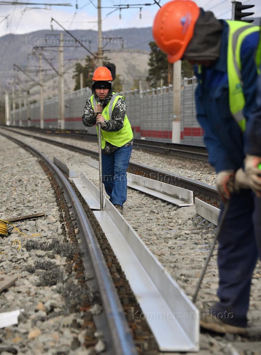 Environmental press tour to Baikal. Construction and installation works on the Severobaikalsk - Tyya section of the Baikal-Amur Mainline (BAM). Technical train on railway tracks.