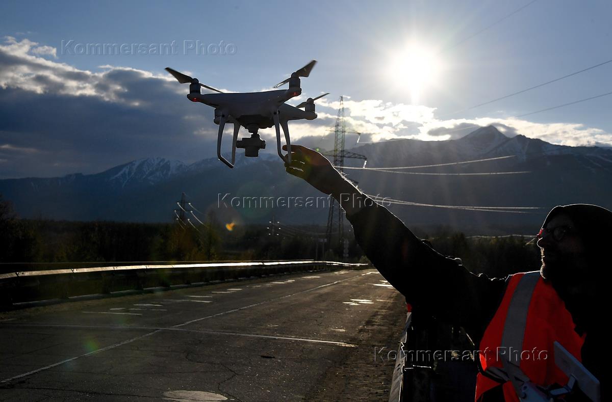 Виды Бурятии в районе Байкало-Амурской магистрали (БАМ). Жанровая фотография. Фотограф во время запуска дрона.