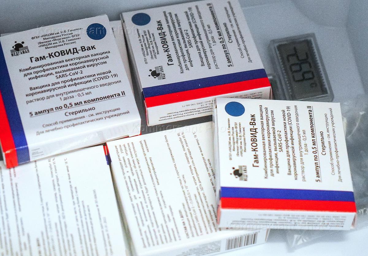Вакцинация от коронавирусной инфекции COVID-19 в поликлиническом отделении №64. Жанровая фотография. Упаковка с ампулами вакцины Гам-Ковид-вак ("Спутник V").