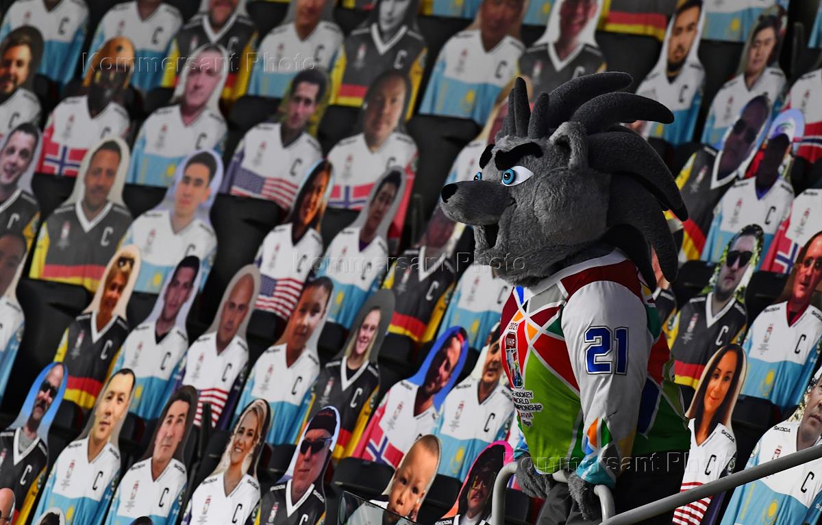 Чемпионат мира по хоккею 2021. Матч между сборными США и Германии на стадионе "Арена-Рига". Талисман Чемпионата Ежик по имени Спайки перед началом матча.