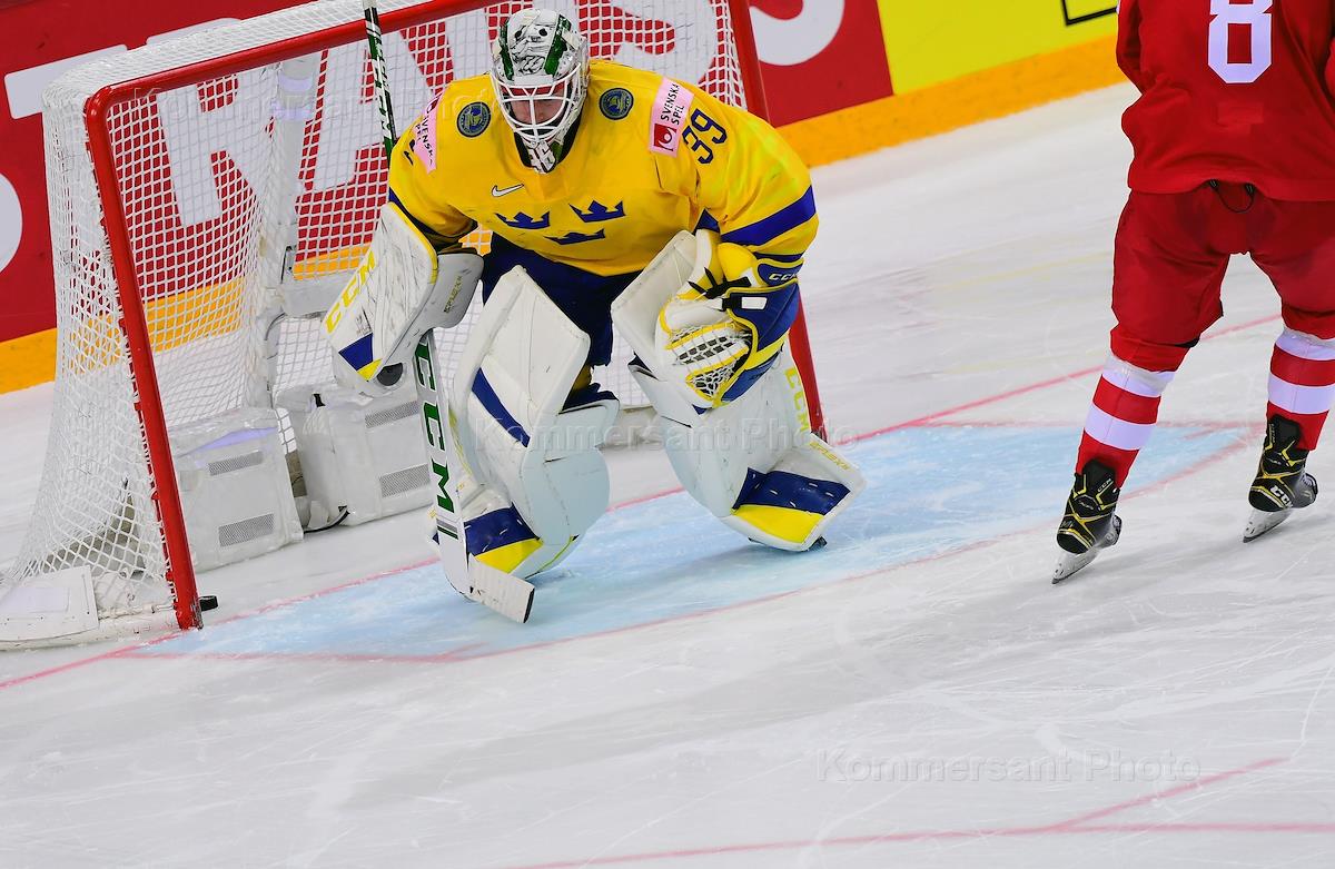 Чемпионат мира по хоккею 2021. Матч между сборными России и Швеции на стадионе Олимпийского Спортивного Центра. Вратарь сборной Швеции Адам Рейдеборн во время мачта.