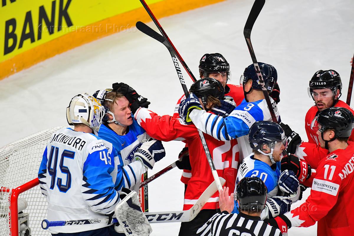 Чемпионат мира по хоккею 2021. Матч между сборными Финляндии и Канады на стадионе "Арена-Рига". Игроки во время матча.