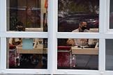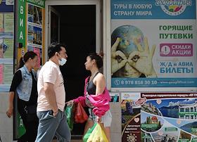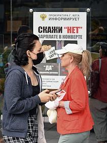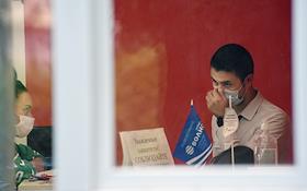 Виды Ялты. Жанровая фотография. Служащие банка в защитных масках во время работы в офисе.