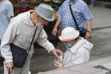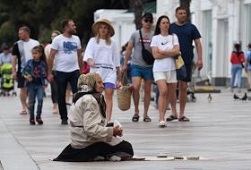 Виды Ялты. Жанровая фотография. Пожилая женщина просит милостыню на набережной города.