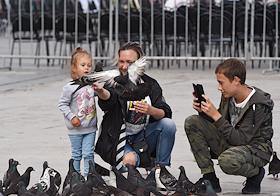 Виды Ялты. Жанровая фотография. Женщина с детьми кормит голубей.