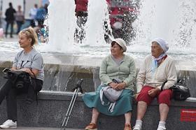 Жанровая фотография. Пожилые женщины сидят на огражении фонтана.
