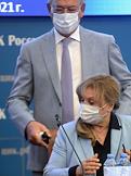 Заседание Центральной избирательной комиссии (ЦИК) России. Председатель ЦИК России Элла Памфилова (справа) и заместитель председателя ЦИК России Николай Булаев (слева) перед началом заседания.