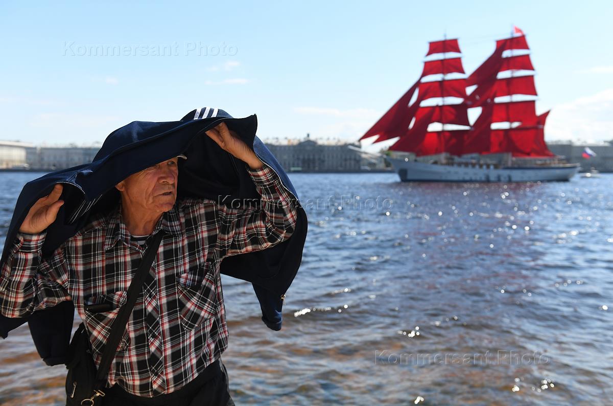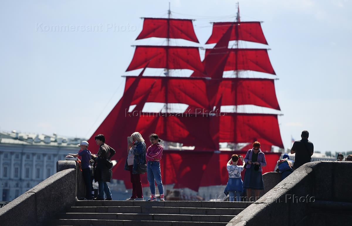 Виды Санкт-Петербурга во время репетиции Ежегодного праздника выпускников "Алые паруса".Жанровая фотография. Бриг "Россия" на причале в акватории Невы. Отдыхающие на пляже у Петропавловской крепости.