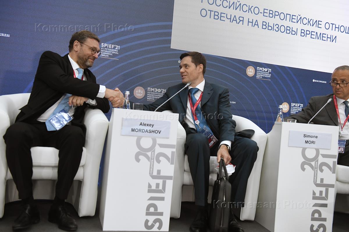 XXIV Петербургский международный экономический форум (ПМЭФ) 2021 прошел в конгрессно-выставочном центре "Экспофорум". Слева направо: заместитель председателя Совета Федерации России Константин Косачев, генеральный директор ООО "Севергрупп" Алексей Мордашов и глава дивизиона Европа и Евро-средиземноморский регион Enel S.p.А. Симоне Мори во время сессии "Российско-европейские отношения: отвечая на вызовы времени".