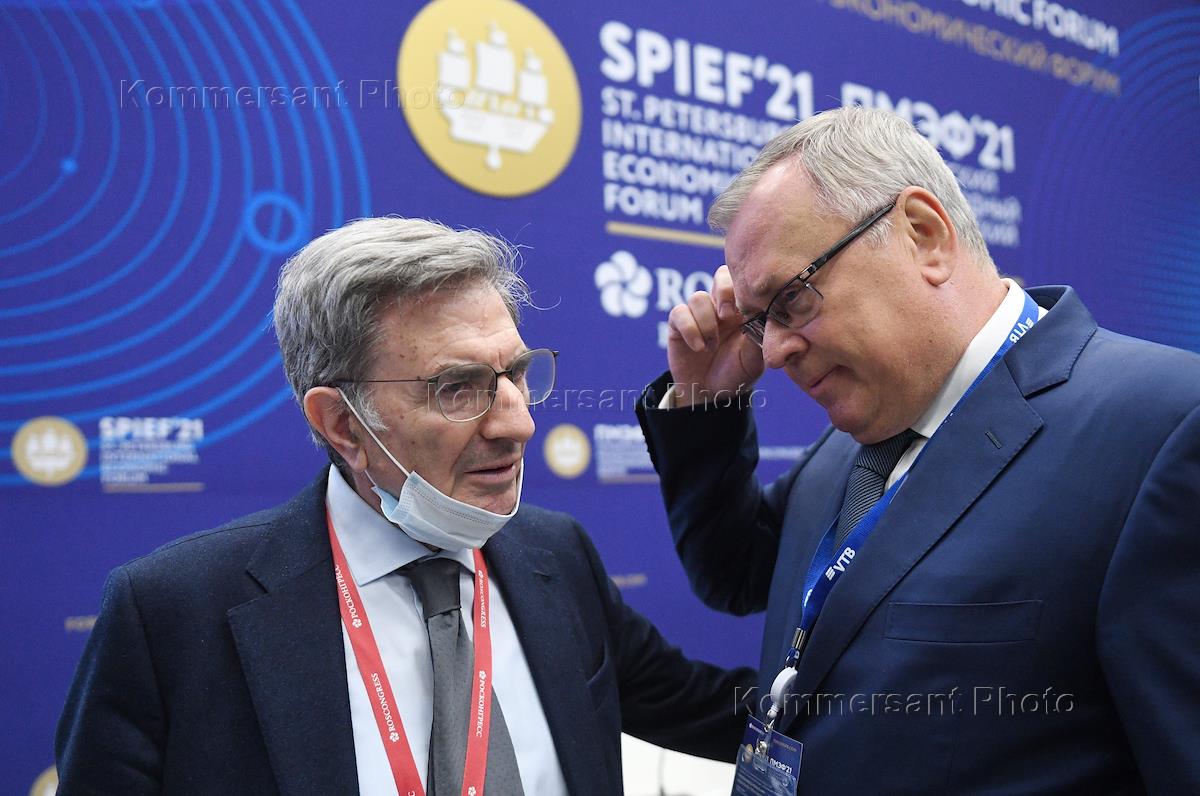 XXIV Петербургский международный экономический форум (ПМЭФ) 2021 прошел в конгрессно-выставочном центре "Экспофорум". Президент, председатель правления ПАО "Банк ВТБ" Андрей Костин (справа) и президент Асоциации "Познаем Евразию" Антонио Фаллико (слева) во время форума.