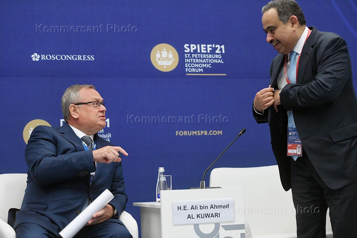 XXIV Петербургский международный экономический форум (ПМЭФ) 2021 прошел в конгрессно-выставочном центре "Экспофорум". Министр торговли и промышленности Катара Али бин Ахмед аль-Кувари (справа) и президент, председатель правления ПАО "Банк ВТБ" Андрей Костин (слева) во время форума.