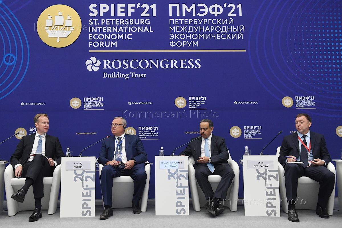 XXIV Петербургский международный экономический форум (ПМЭФ) 2021 прошел в конгрессно-выставочном центре "Экспофорум". Справа налево: основатель ГК "РУСАЛ" и фонда "Вольное дело" Олег Дерипаска, министр торговли и промышленности Катара Али бин Ахмед аль-Кувари и президент, председатель правления ПАО "Банк ВТБ" Андрей Костин во время форума.