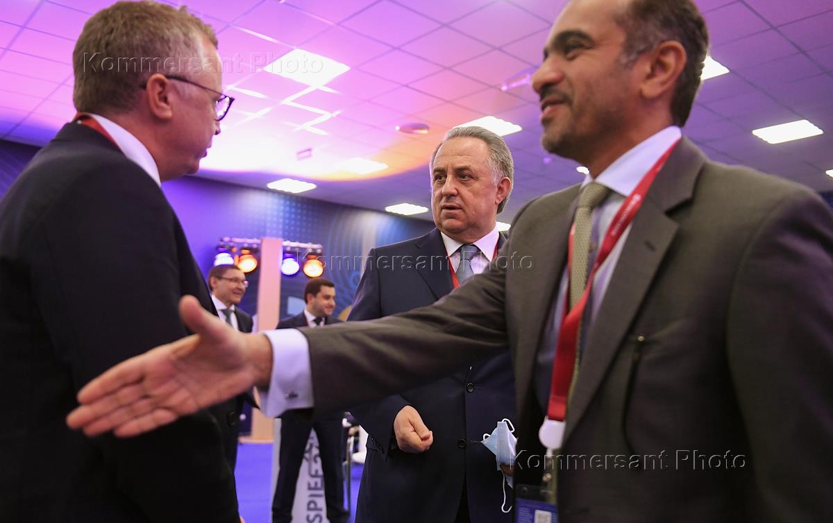 XXIV Петербургский международный экономический форум (ПМЭФ) 2021 прошел в конгрессно-выставочном центре "Экспофорум". Слева направо: вице-президент по стратегическому развитию, исполнительный член совета директоров ПАО "ЛУКОЙЛ" Леонид Федун, генеральный директор АО "ДОМ.РФ" Виталий Мутко и заместитель руководителя администрации президента России - пресс-секретарь президента России Дмитрий Песков во время форума.
