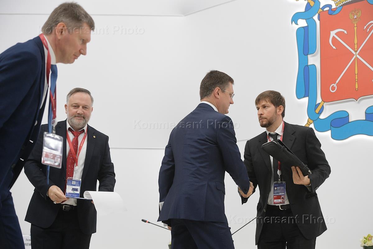 The XXIV St. Petersburg International Economic Forum (SPIEF) 2021 was held at the Expoforum Convention and Exhibition Center. Session "Adaptation to Climate Change: Challenges and Opportunities". Left to right: Russian Minister of Economic Development Maxim Reshetnikov, owner and editor-in-chief of the FederalPress news agency Ivan Eremin, Deputy Prime Minister of Russia Alexander Novak and Climate Advisor Ruslan Edelgeriev during the forum.