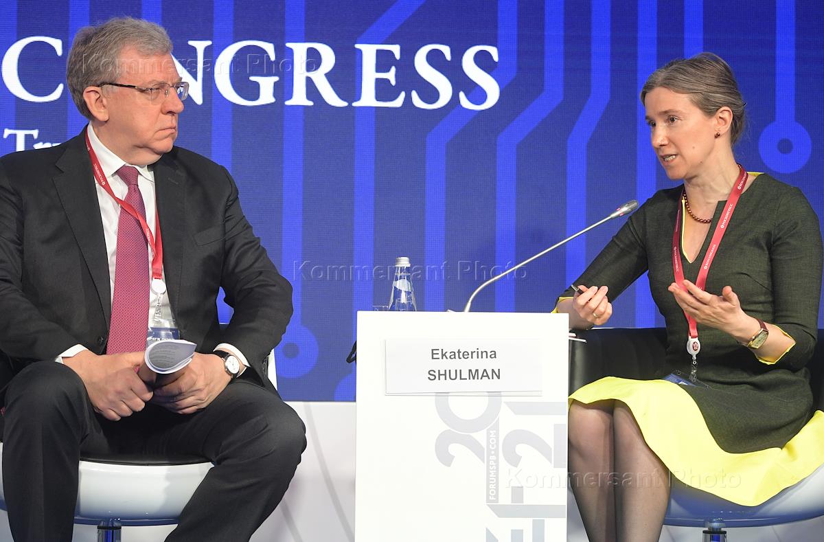 XXIV Петербургский международный экономический форум (ПМЭФ) 2021 прошел в конгрессно-выставочном центре "Экспофорум". Сессия "Концепция открытости 2.0. Как должна строиться политика открытости государства в России". Председатель Счетной палаты России Алексей Кудрин (слева) и политолог Екатерина Шульман (справа) во время работы сессии.