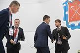 XXIV Петербургский международный экономический форум (ПМЭФ) 2021 прошел в конгрессно-выставочном центре "Экспофорум". Сессия "Адаптация к климатическим изменениям: вызовы и возможности". Первый заместитель председателя комитета Государственной думы России по физической культуре, спорту, туризму и делам молодежи Вячеслав Фетисов (слева) и владелец газеты "Ведомости" Иван Еремин (справа) перед началом работы сессии.