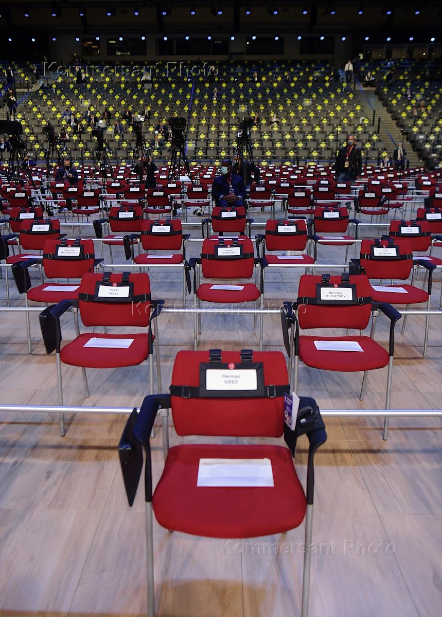 XXIV Петербургский международный экономический форум (ПМЭФ) 2021 прошел в конгрессно-выставочном центре "Экспофорум". ЖАнровая фотография. Стулья с именными табличками для участников пленарного заседания.