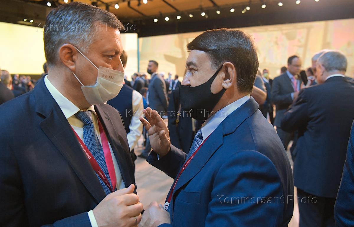 XXIV Петербургский международный экономический форум (ПМЭФ) 2021 прошел в конгрессно-выставочном центре "Экспофорум". Руководитель фракции партии "Единая Россия" в Государственной думе (ГД) России Сергей Неверов (слева) и первый заместитель председателя комитета ГД РОссии по бюджету и налогам Глеб Хор (справа) во время форума.