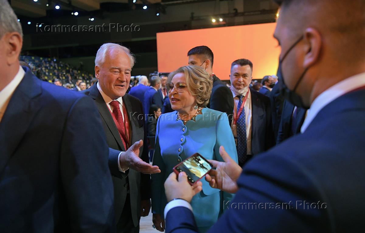 The XXIV St. Petersburg International Economic Forum (SPIEF) 2021 was held at the Expoforum Convention and Exhibition Center. Chairman of the Russian State Duma Vyacheslav Volodin (center) before the plenary session of the forum.