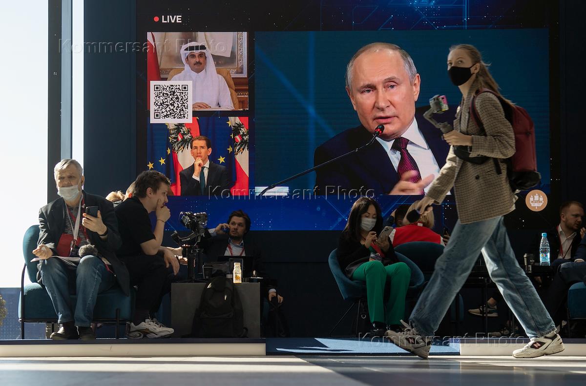 XXIV Петербургский международный экономический форум (ПМЭФ) 2021 прошел в конгрессно-выставочном центре "Экспофорум". Президент России Владимир Путин во время выступления на пленарном заседании форума.
