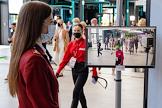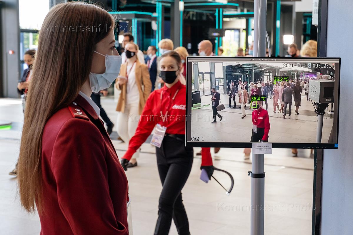 XXIV Петербургский международный экономический форум (ПМЭФ) 2021 прошел в конгрессно-выставочном центре "Экспофорум". Сотрудница Роспотребнадзора контролирует температуру участников форума при помощи безконтактной системы.