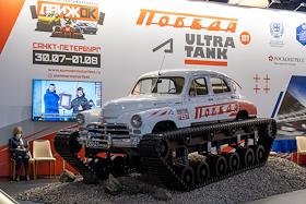 XXIV Петербургский международный экономический форум (ПМЭФ) 2021 прошел в конгрессно-выставочном центре "Экспофорум". Макет автомобиля "Победа" на гусеничном ходу на стенде.