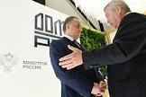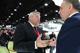 XXIV Петербургский международный экономический форум (ПМЭФ) 2021 прошел в конгрессно-выставочном центре "Экспофорум". Генеральный директор АО "ДОМ.РФ" Виталий Мутко (справа) и губернатор Ростовской области Василий Голубев (слева) у стенда "ДОМ.РФ".