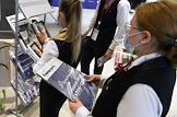 XXIV Петербургский международный экономический форум (ПМЭФ) 2021 прошел в конгрессно-выставочном центре "Экспофорум". Жанровая фотография. Стенд компании "Аэрофлот". Стюардесса в фирменной форме.