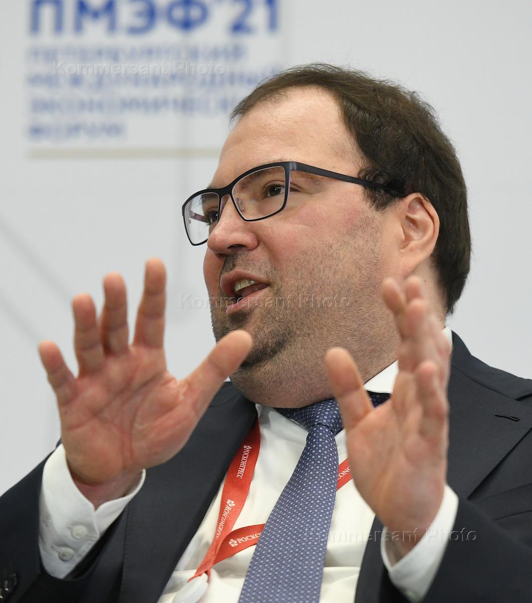 XXIV Петербургский международный экономический форум (ПМЭФ) 2021 прошел в конгрессно-выставочном центре "Экспофорум". Сессия "Пандемии будущего. Стратегии готовности". Министр цифрового развития, связи и массовых коммуникаций России Максут Шадаев во время работы сессии.