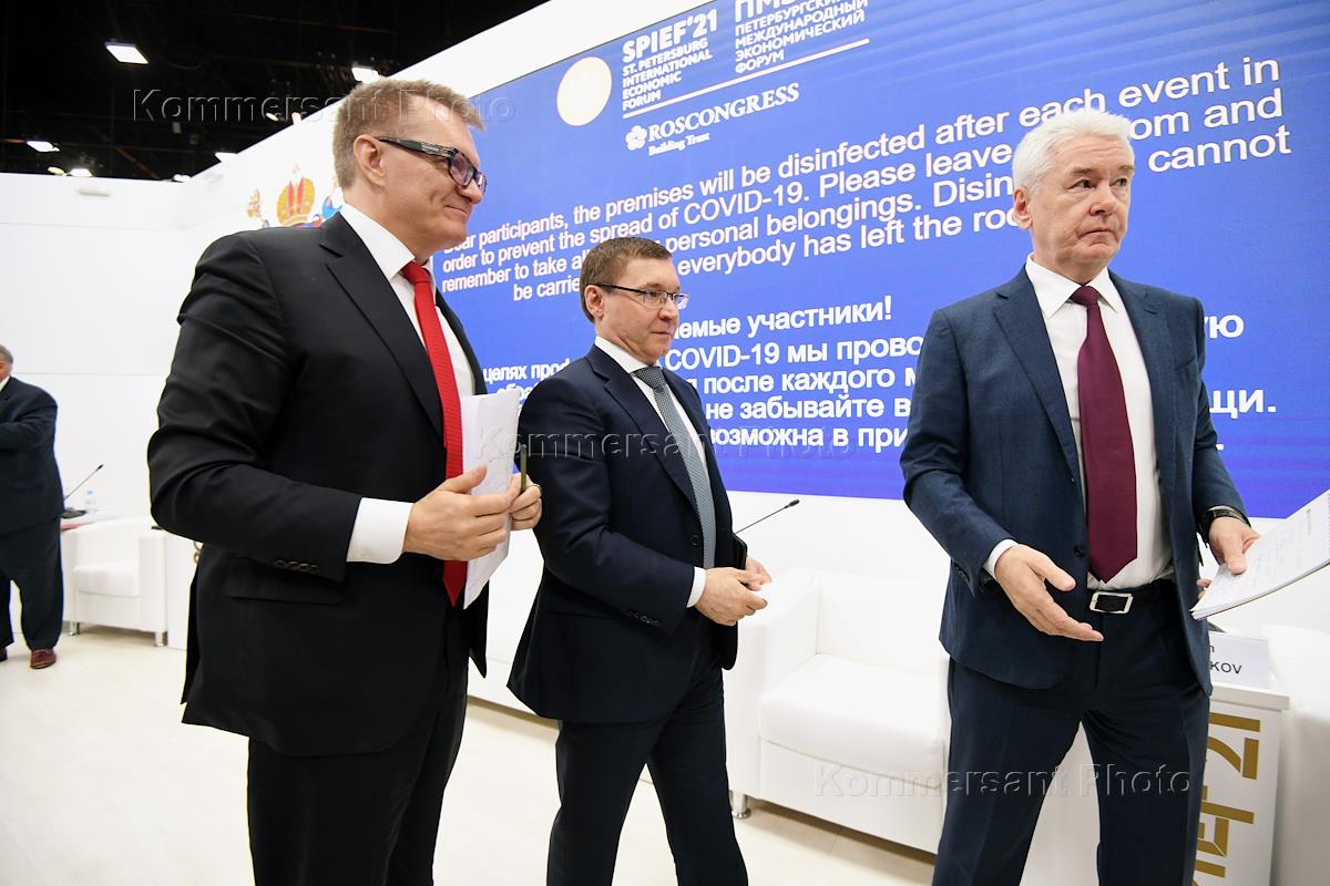 XXIV Петербургский международный экономический форум (ПМЭФ) 2021 прошел в конгрессно-выставочном центре "Экспофорум". Сессия "Качественный рост: развитие агломераций в ответ на глобальные вызовы". Мэр Москвы Сергей Собянин (в центре) перед началом сессии.