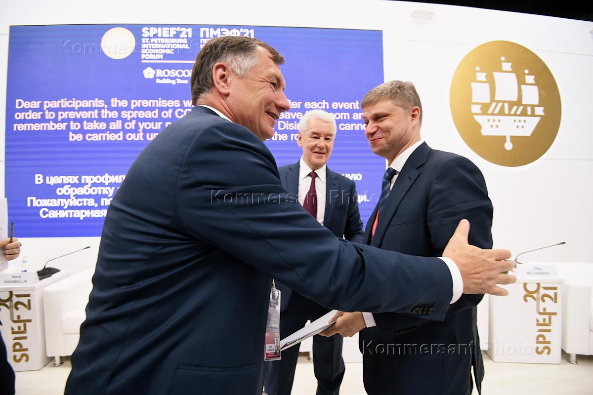 XXIV Петербургский международный экономический форум (ПМЭФ) 2021 прошел в конгрессно-выставочном центре "Экспофорум". Сессия "Качественный рост: развитие агломераций в ответ на глобальные вызовы". Слева направо: заместитель председателя правительства России Марат Хуснуллин, мэр Москвы Сергей Собянин и генеральный директор - председатель правления ОАО "РЖД" Олег Белозеров на сессии.