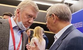 XXIV Петербургский международный экономический форум (ПМЭФ) 2021 прошел в конгрессно-выставочном центре "Экспофорум". Специальный представитель президента России по связям с международными организациями для достижения целей устойчивого развития Анатолший Чубайс (слева) и председатель совета директоров ПАО "АФК "Система" Владимир Евтушенков (справа) во время форума.