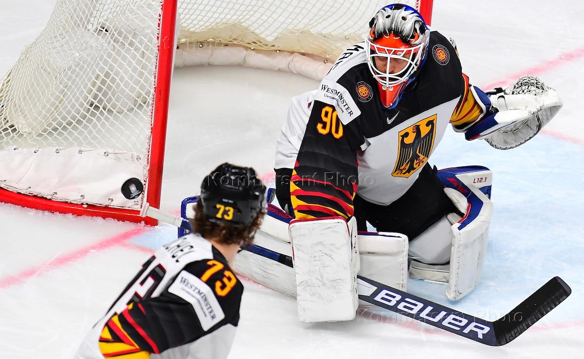Чемпионат мира по хоккею 2021. Матч за третье место. Матч между сборными США и Германии на стадионе "Арена-Рига". Вратарь сборной Германии Феликс Брюкман (в центре) во время матча.