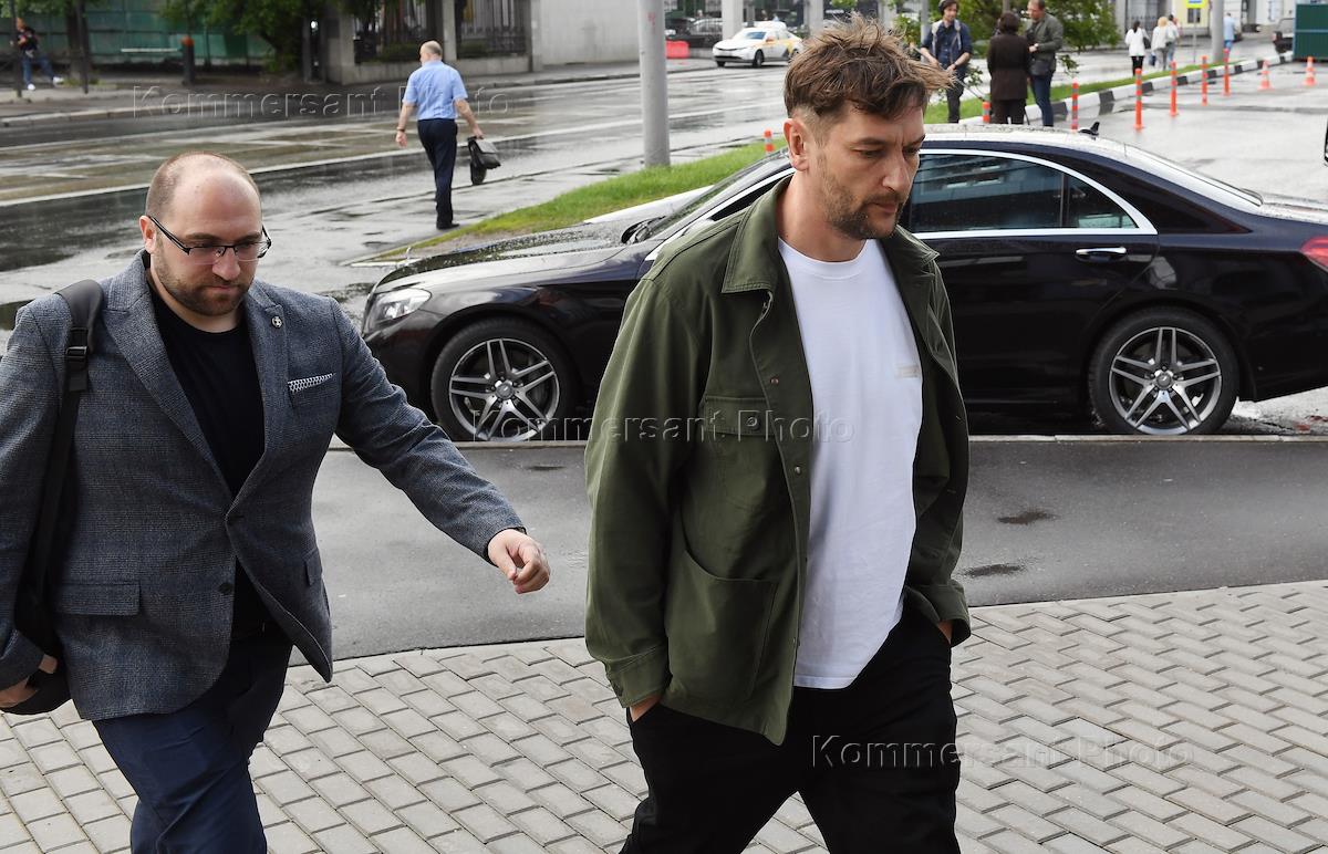 Брат политика Алексея Навального Олег Навальный (справа), обвиняемый в нарушении санитарно-эпидемиологических правил, и его адвокат Никос Параскевов (слева) перед началом предварительных слушаний в Тверском районном суде.