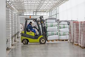 Работа тепличного хозяйства агрохолдинга "Московский". Жанровая фотография. Вилочный погрузчик на складе удобрений.