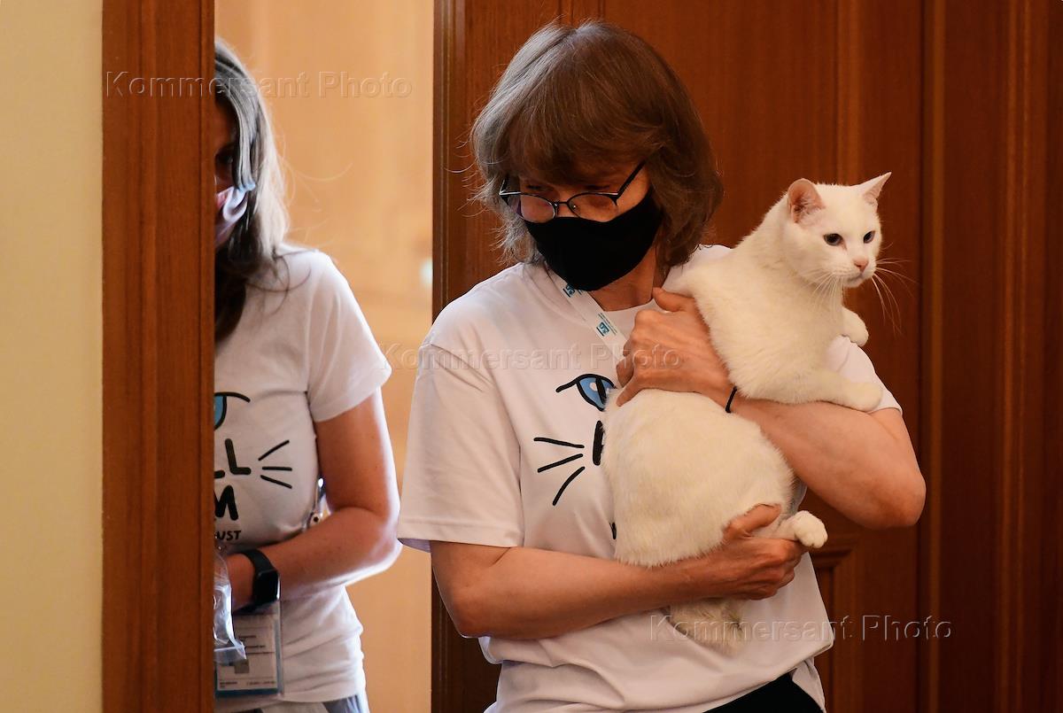 Церемония предсказания кота Ахилла из Эрмитажа исхода матча между сборными Италии и Турции на Чемпионате Европы по футболу ЕВРО-2020 прошла в Городском пресс-центре ЕВРО-2020. Слева направо: директор котокафе "Республика кошек", хозяйка и пресс-секретарь кота Ахилла Анна Кондратьева, пресс-секретарь эрмитажных котов Мария Халтунен и кот Ахилл во время церемонии.