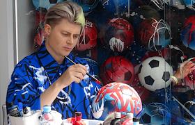 Чемпионат Европы по футболу Евро-2020 (УЕФА EURO 2020). Футбольная деревня Фестиваля УЕФА EURO 2020 на Конюшенной площади. Художник-каллиграф Покрас Лампас раскрашивает футбольные мячи для своего арт-проекта.